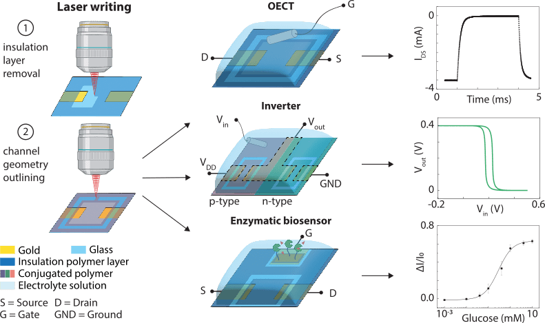- Enrico, A., Buchmann, S., De Ferrari, F., Lin, Y., Wang, Y., Yue, W., Mårtensson, G., Stemme, G., Hamedi, M. M., Niklaus, F., Herland, A., & Zeglio, E. (2024). Cleanroom‐Free Direct Laser Micropatterning of Polymers for Organic Electrochemical Transistors in Logic Circuits and Glucose Biosensors. Advanced Science (Vol. 11, Issue 27). Wiley. doi: 10.1002/advs.202307042