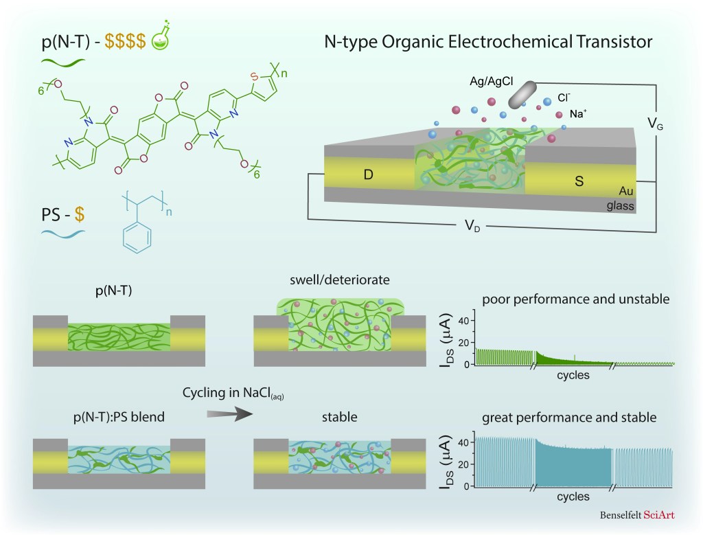 In one of our works, we blended semiconductors with insulating polymers to improve their mixed ionic/electronic conductivity without modifying their chemical structure. The method has been used to improve the performance of bioelectronic devices while minimizing materials´ costs and environmental impact.